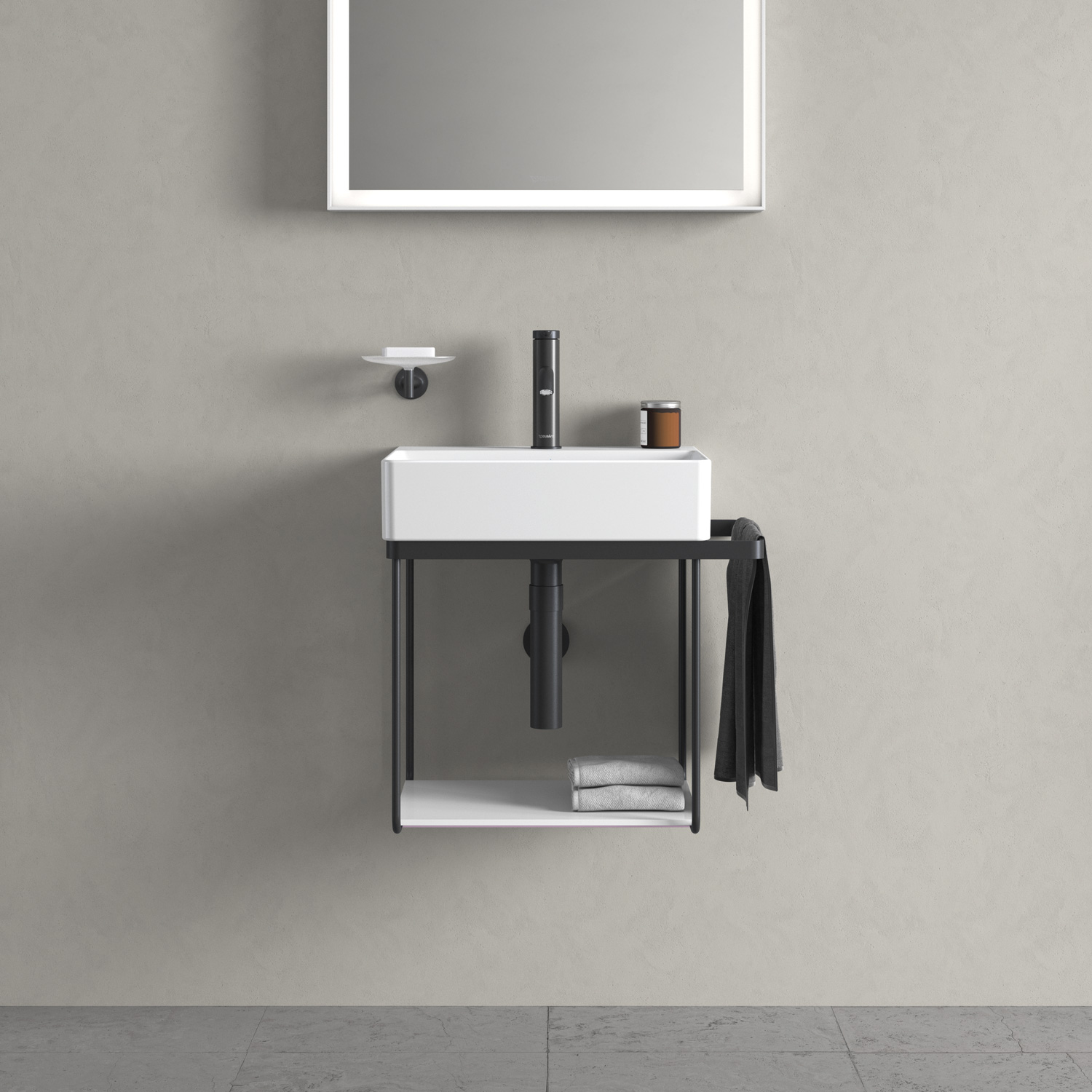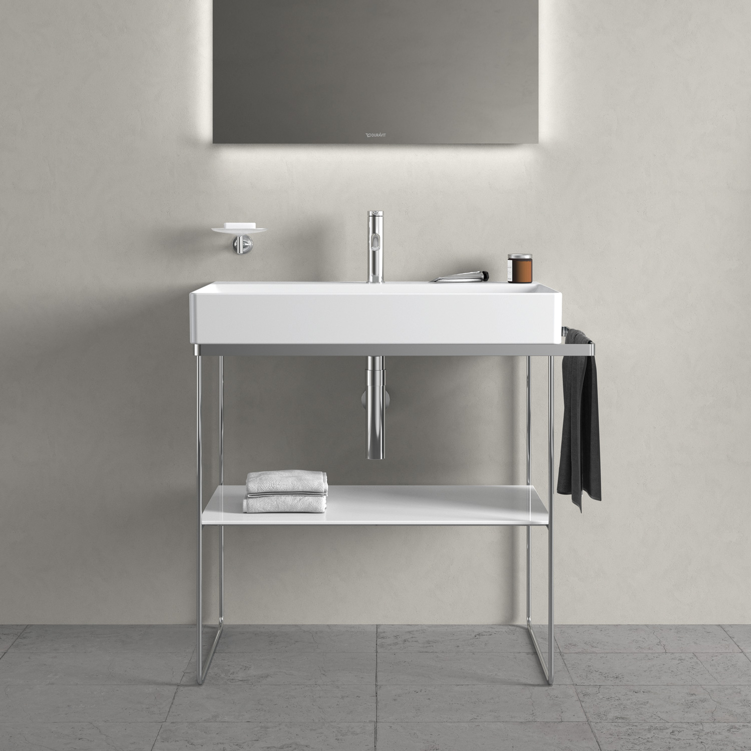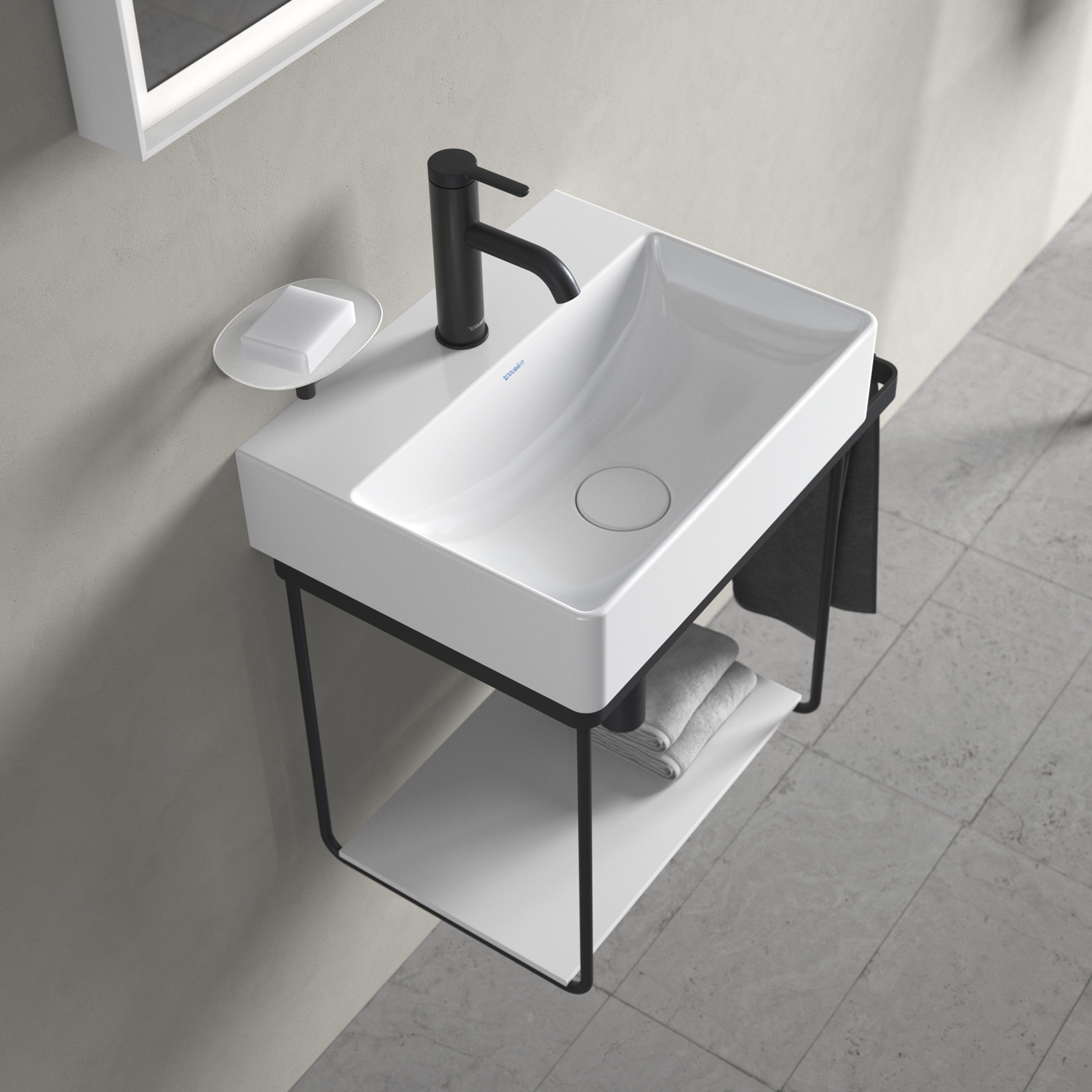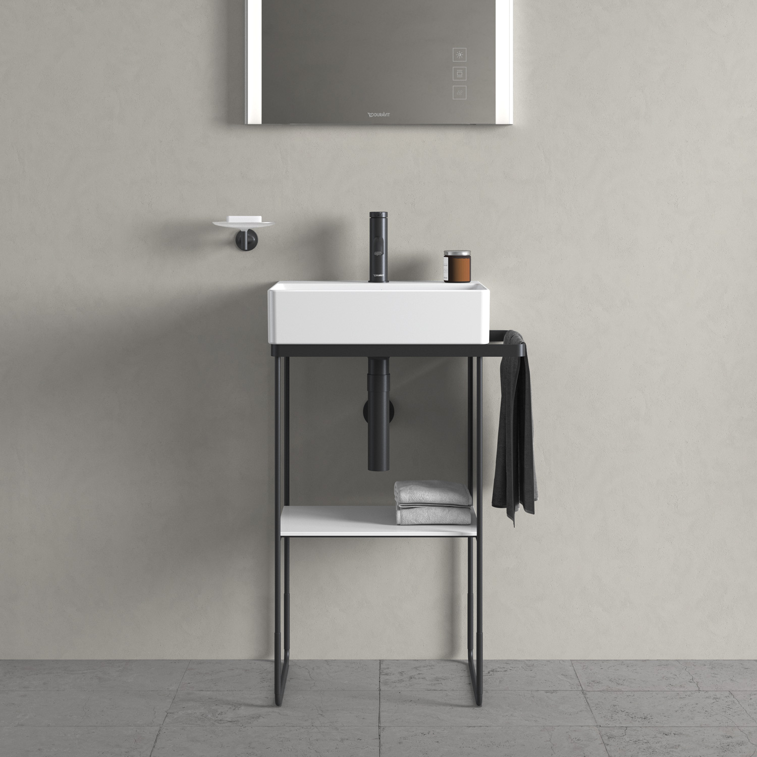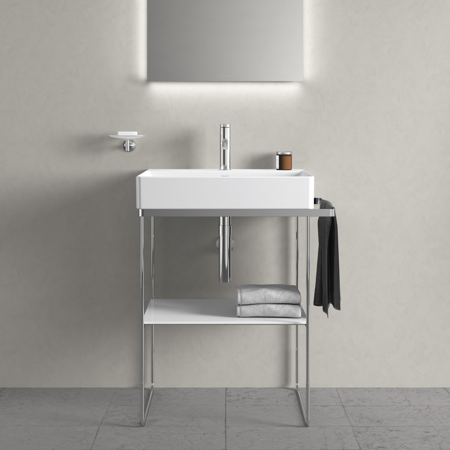 Металлические консоли Duravit DuraSquare, доступные в современном матовом черном или хромированном цвете, придают легкость и стильный вид. Эти модели особенно универсальны, поскольку они регулируются по высоте и могут поставляться с дополнительным держателем для полотенец справа или слева. Независимо от того, выберете ли вы напольную или настенную версию, практичная стеклянная вставка создаст дополнительное место для хранения вещей. Вы можете выбрать разные цвета стекла и проявить свою индивидуальность.