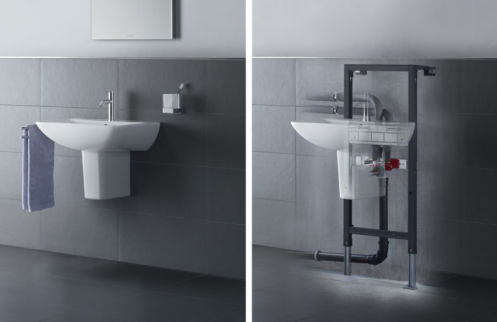 DuraSystem® предлагает три монтажные рамы для зоны умывальника. Наряду с версией для стандартных умывальников существует также вариант для специальных умывальников, а также другое решение для настенного монтажа.