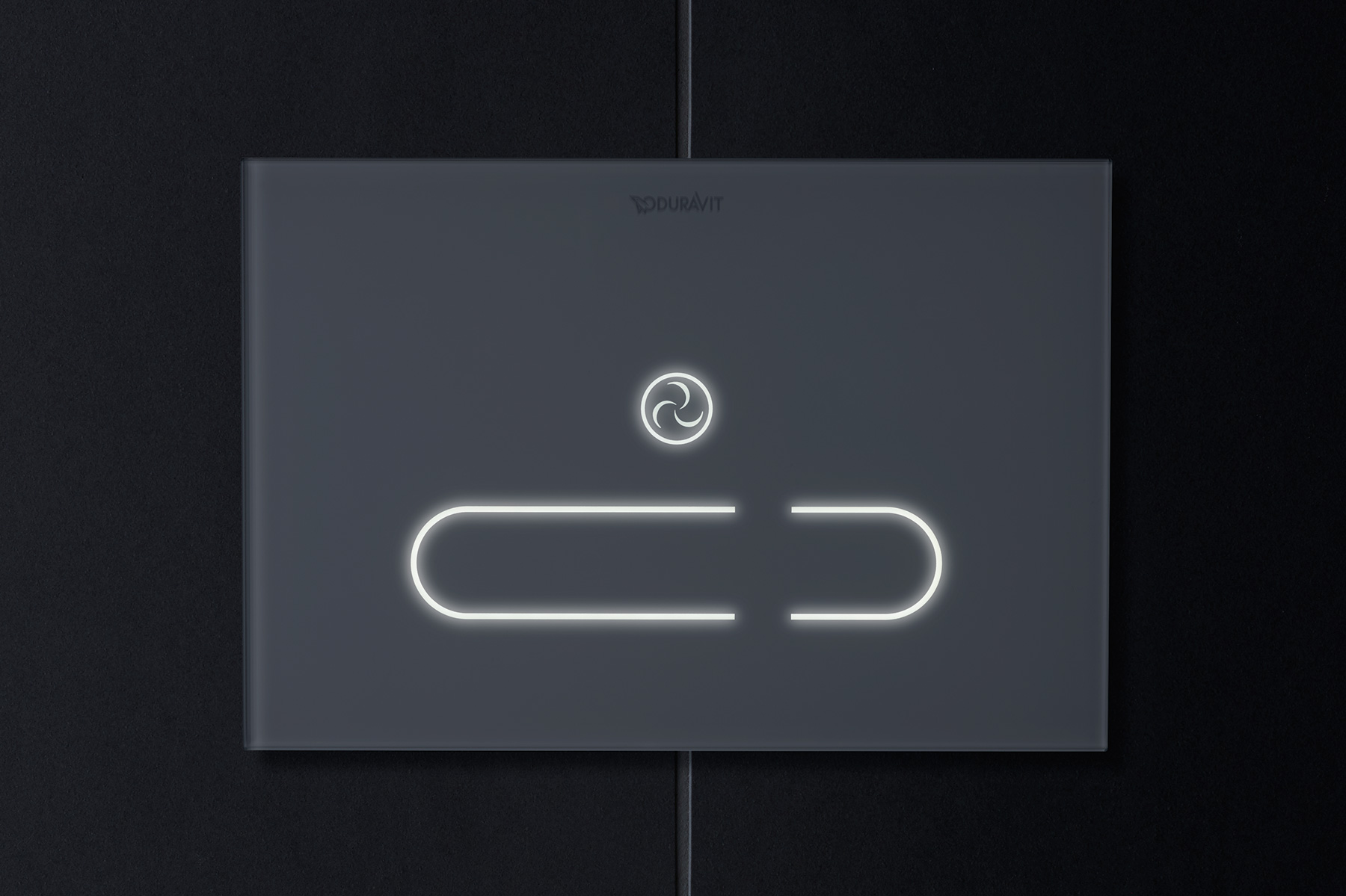 Электронная кнопка активации унитаза A2 изготовлена из белого закаленного безопасного стекла и монтируется на поверхность. Табличка не подсвечивается в режиме ожидания. Инфракрасный датчик активирует подсветку символов, когда они обнаруживают движение поблизости.