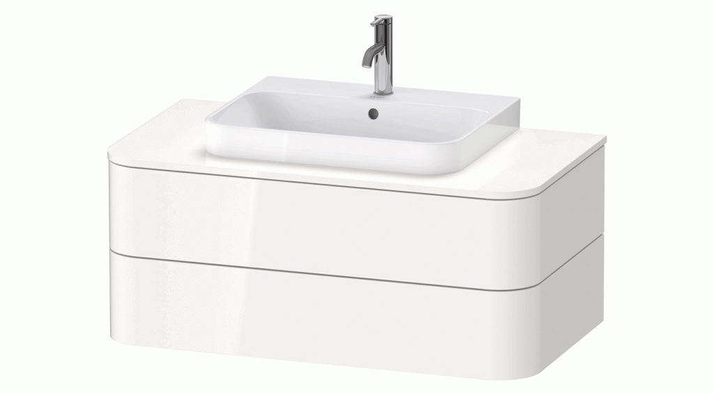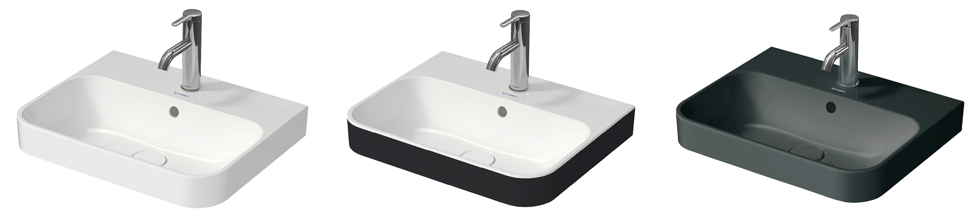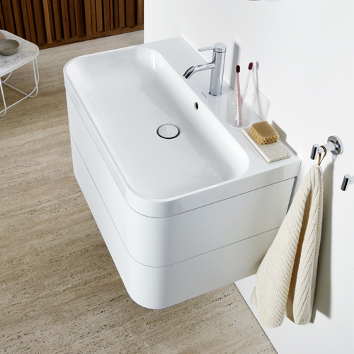 Идеальный оптический блок: моечная зона Happy D.2 Plus c-bonded. Специально разработанная для характерной формы серии, эта запатентованная технология c-bonded впервые позволяет практически бесшовно соединить закругленную керамику с соответствующей мебелью для ванной комнаты. Мебельный умывальник можно комбинировать со шкафчиком под раковину или с новой напольной металлической консолью черного матового цвета со встроенным полотенцесушителем.