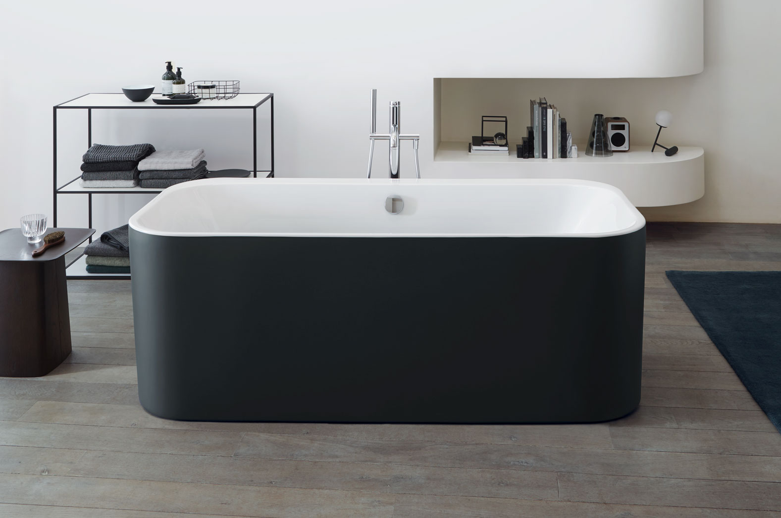 Напольные металлические консоли с регулируемой высотой и встроенным полотенцесушителем могут поставляться с дополнительной полкой или встроенным ящиком. Настенные тумбочки с двумя ящиками обеспечивают дополнительное место для хранения вещей. Они доступны в общей сложности с одиннадцатью поверхностями каркаса, можно выбирать между роскошной древесиной или матовыми поверхностями светлого или темного цвета. Вариант Graphite Super Matt также имеет покрытие, не оставляющее отпечатков пальцев.