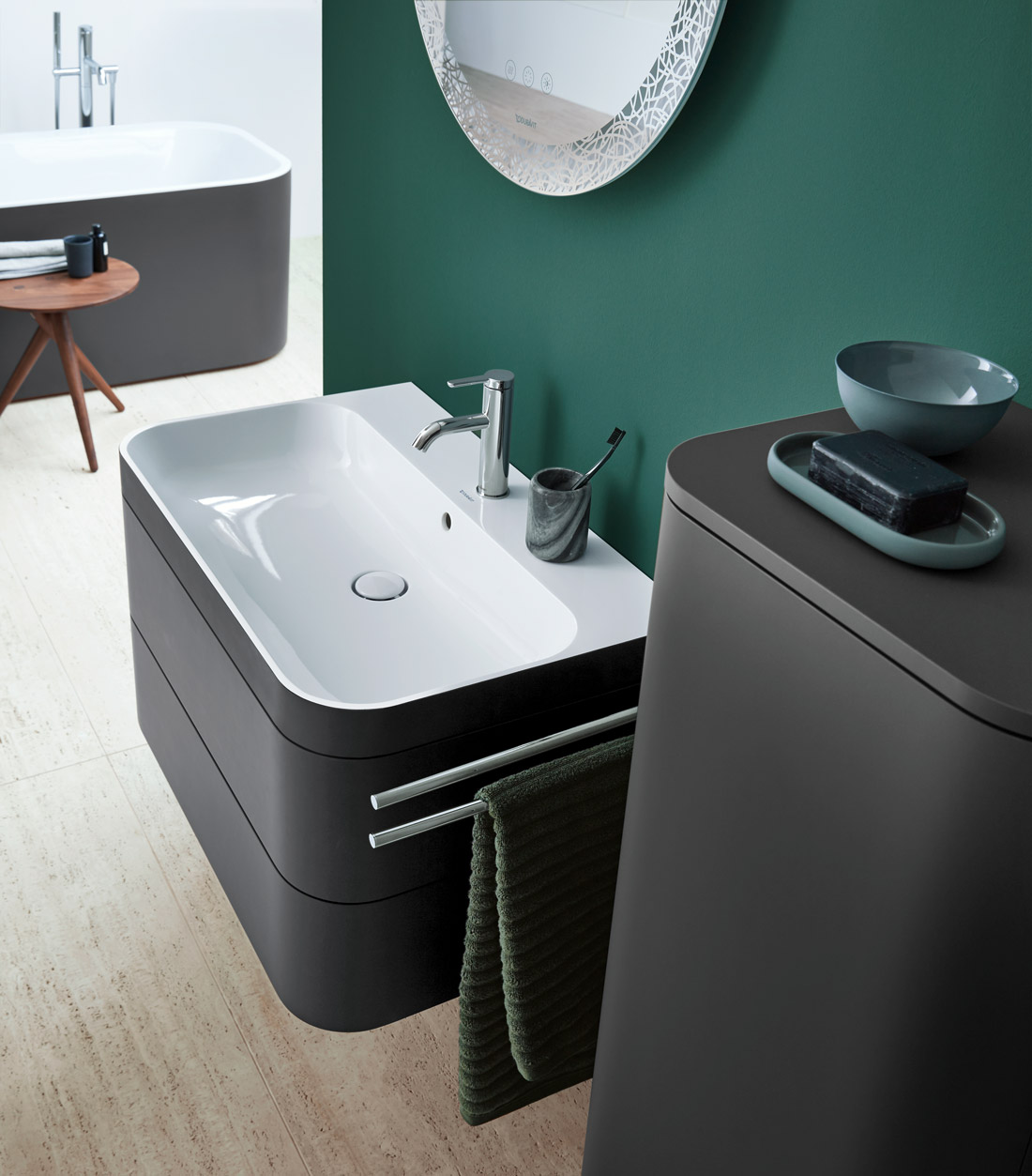 В Happy D.2 Plus Duravit объединилась с Sieger Design, чтобы реализовать текущие тенденции в цветах, дизайне и отделке. Типичный открытый овал классического дизайна Happy D. Накладные раковины, отдельные консоли и соответствующие высокие и полувысокие шкафы, а также круглые зеркала объединяются, чтобы создать идеально гармонизированные зоны для мытья.
