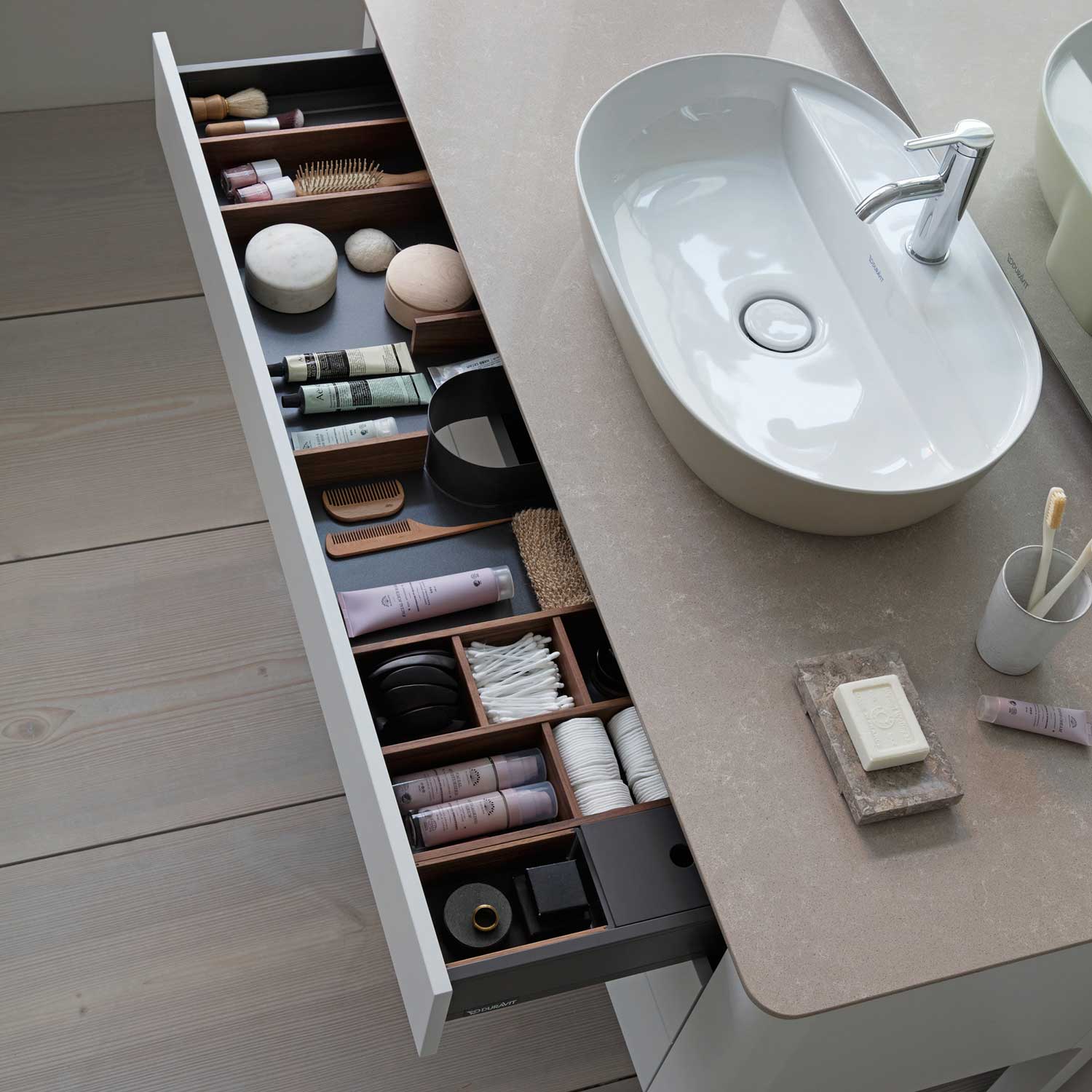 Современная интерпретация туалетных столиков Duravit Luv включает в себя регулируемые по высоте ножки и один или два выдвижных ящика, которые плавно открываются и закрываются с помощью технологии Tip-on с самозакрывающимся механизмом. Система органайзеров для верхнего ящика, которая опционально может быть установлена стационарно, доступна из массива ореха или клена. Цвета включают белый, скандинавский белый, серо-коричневый, каменно-серый, миндальный и темно-синий, что позволяет создать совершенно индивидуальный дизайн ванной комнаты.