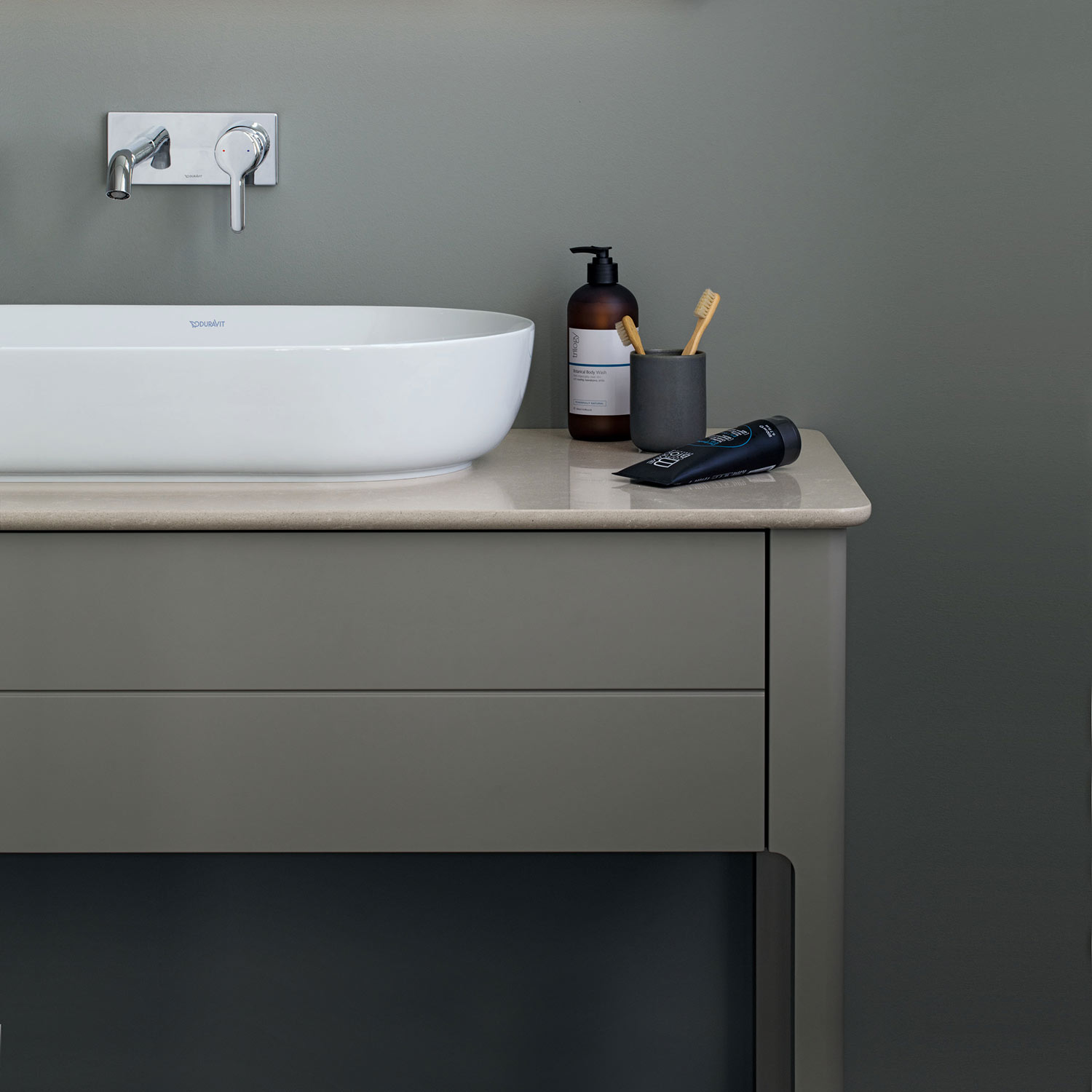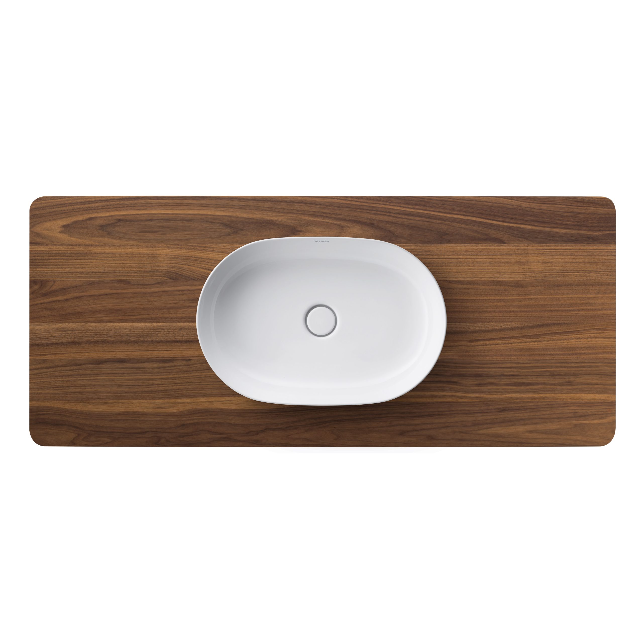 Столешница и раковины серии Duravit Luv изготовлены из материала DuraCeram®, который обеспечивает особенно точные края и просторные внутренние раковины. В сочетании с овальной формой чаши создается необычайно четкий и изысканный дизайн. Настольные мойки Duravit Luv доступны с платформой под смеситель и без нее и могут комбинироваться со смесителями XL, расположенными снаружи или для скрытой установки. Керамическая крышка слива завершает элегантный вид серии Duravit Luv.
