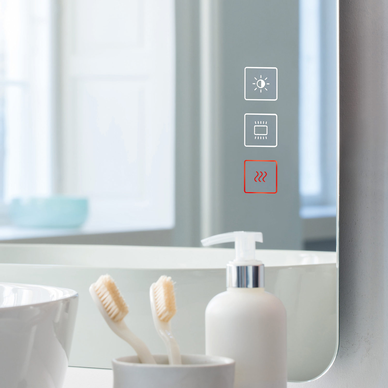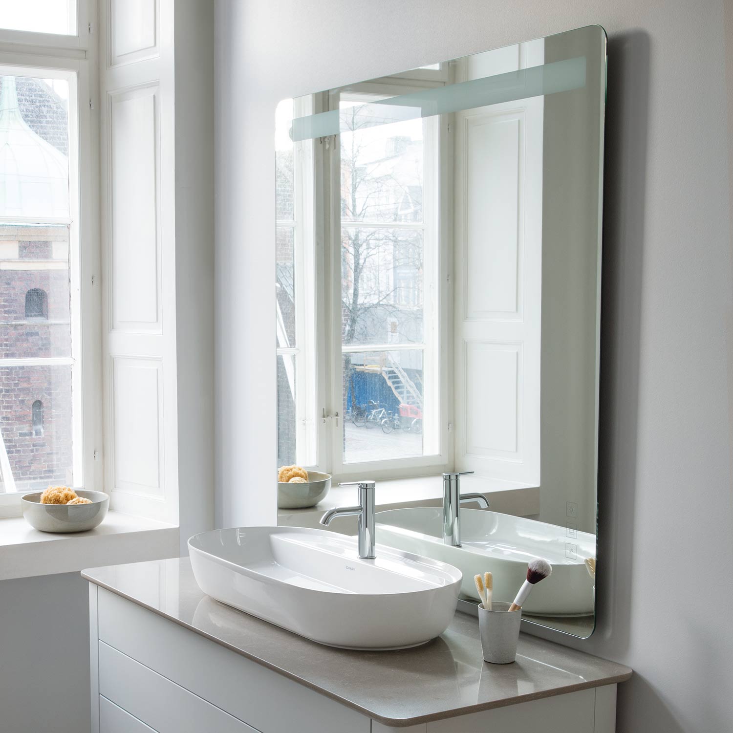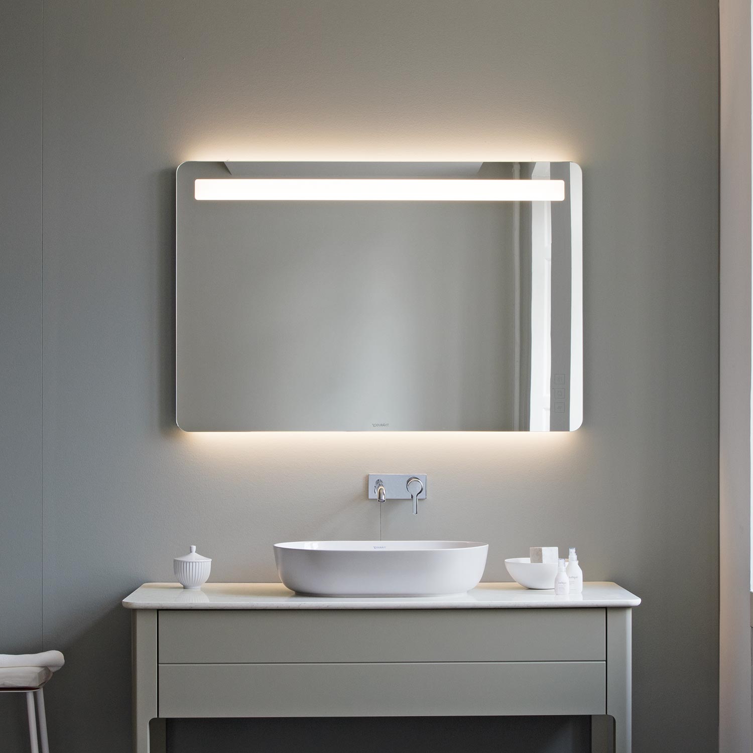 Зеркала для ванной комнаты серии Duravit Luv говорят на том же языке дизайна благодаря своим закругленным углам. Они станут идеальным дополнением к зоне мойки. Бесконтактная регулируемая подсветка по верхнему краю зеркала, а также непрямое освещение сверху и снизу обеспечат идеальное освещение для любого случая. Дополнительные высокотехнологичные предметы незаметно спрятаны в зеркалах Duravit Luv. Светодиодным освещением, функцией затемнения и подогревом зеркал можно управлять с помощью бесконтактной панели управления с пиктограммами, встроенной в зеркало. Подогрев зеркал предотвращает образование запотевания даже после горячего душа.