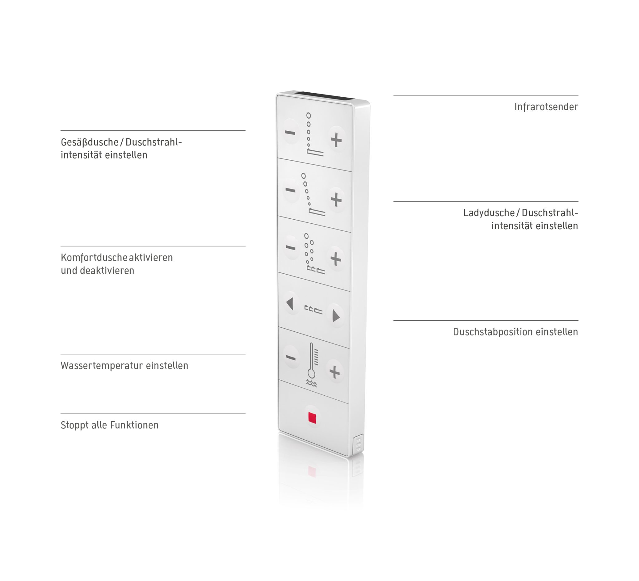 Всеми важными функциями SensoWash® Slim можно удобно управлять с помощью компактного пульта дистанционного управления: просто выберите «мойка для задних пассажиров» или «мойка для дам» после посещения туалета. Температура воды, интенсивность струи душа, положение душевой насадки и комфортный душ регулируются индивидуально. После использования пульт дистанционного управления можно поместить в настенный держатель.