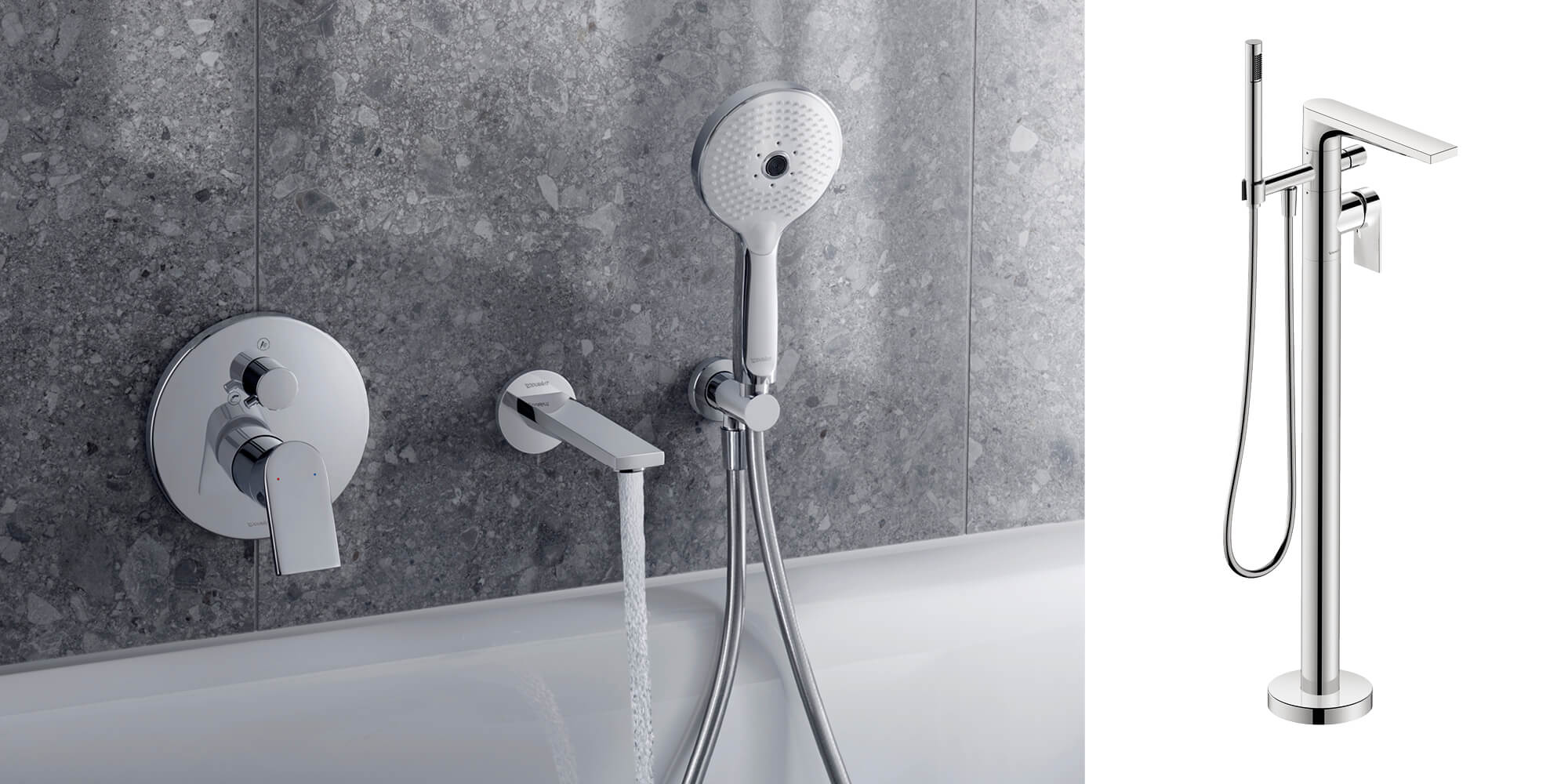Отдельно стоящий смеситель для ванны является особой изюминкой. Благодаря встроенному держателю ручного душа ручной душ-палочка со шлангом и практичным элементом, предотвращающим вращение, можно прикрепить непосредственно к смесителю. Шланг обеспечивает равномерную и мощную дождевую струю. С помощью переключателя легко переключаться между изливом для ванны и ручным душем-стрелкой.