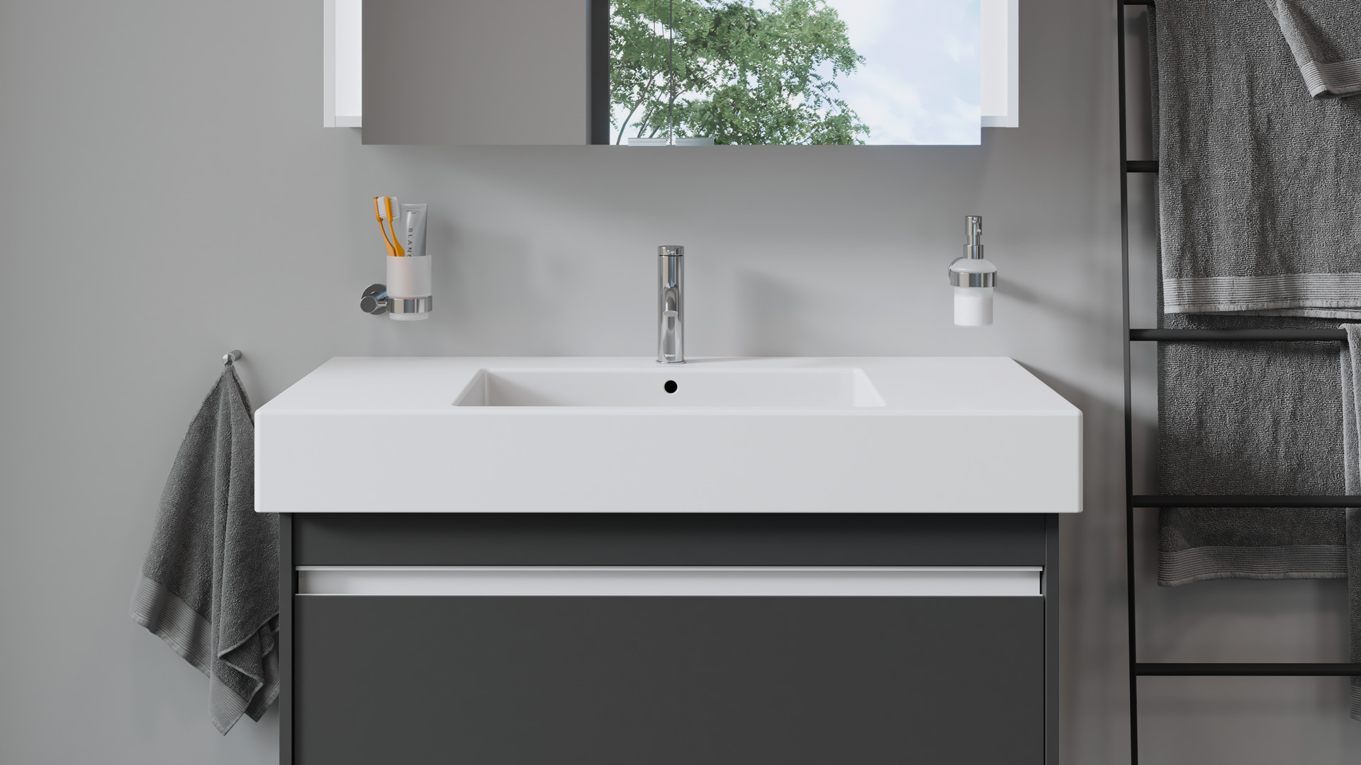 Последовательное использование прямых углов также перенесено в дизайнерскую серию Duravit Vero Air, благодаря чему умывальники Duravit Vero исключительно хорошо сочетаются с унитазами и биде Vero Air. Например, в нашем ассортименте мебели для ванной комнаты Ketho вы найдете подходящие тумбы под раковины Duravit Vero. Прямые линии смесителей C.1 с их изогнутыми изливами и гармоничными изгибами создают захватывающий контраст с прямыми углами, используемыми в умывальниках.