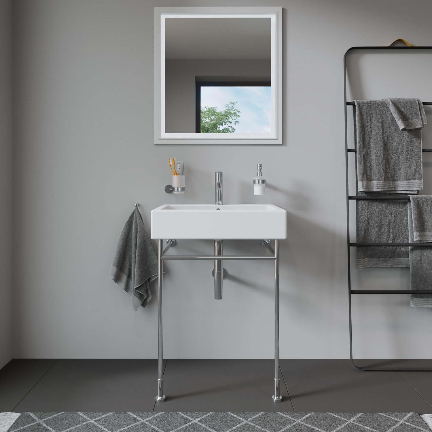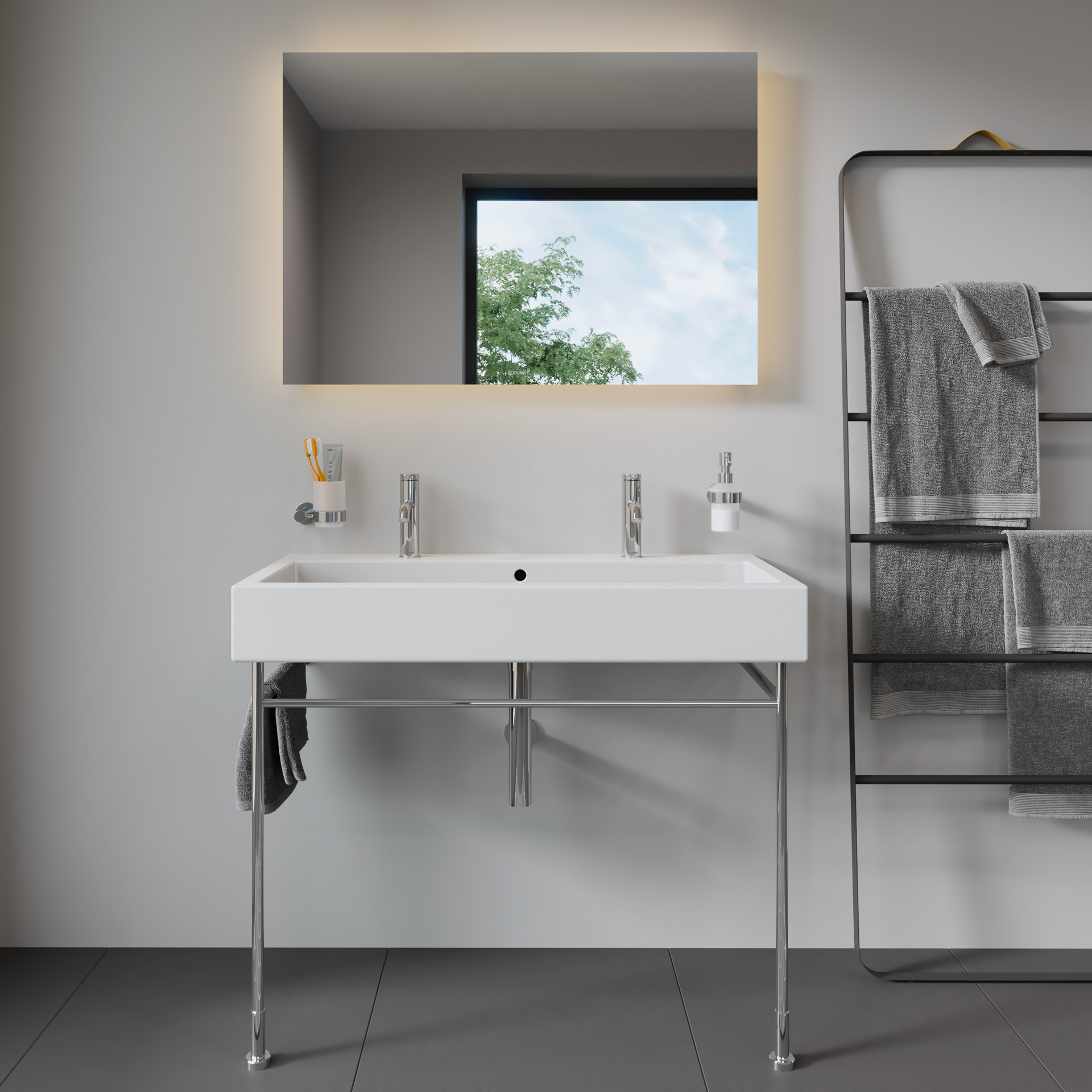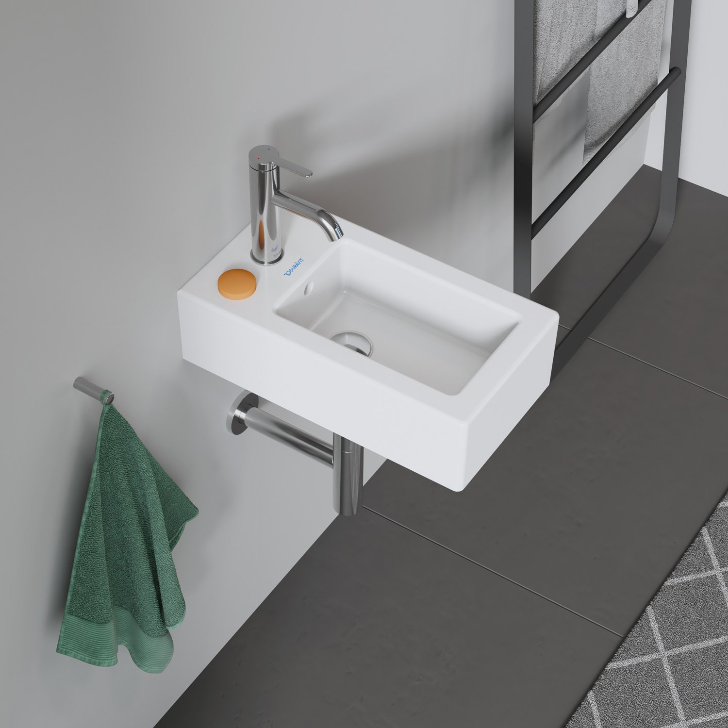 Просто шик: умывальник Duravit Vero с дизайнерским сифоном и хромированной опорной рамой регулируется по высоте и имеет перила, служащие держателем для полотенец.