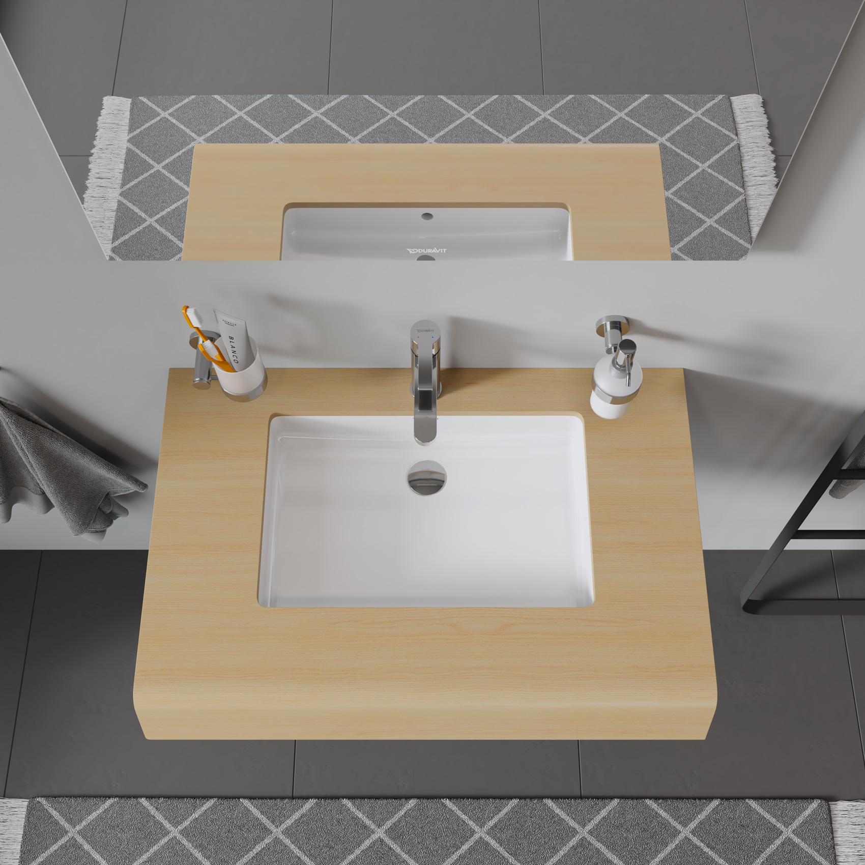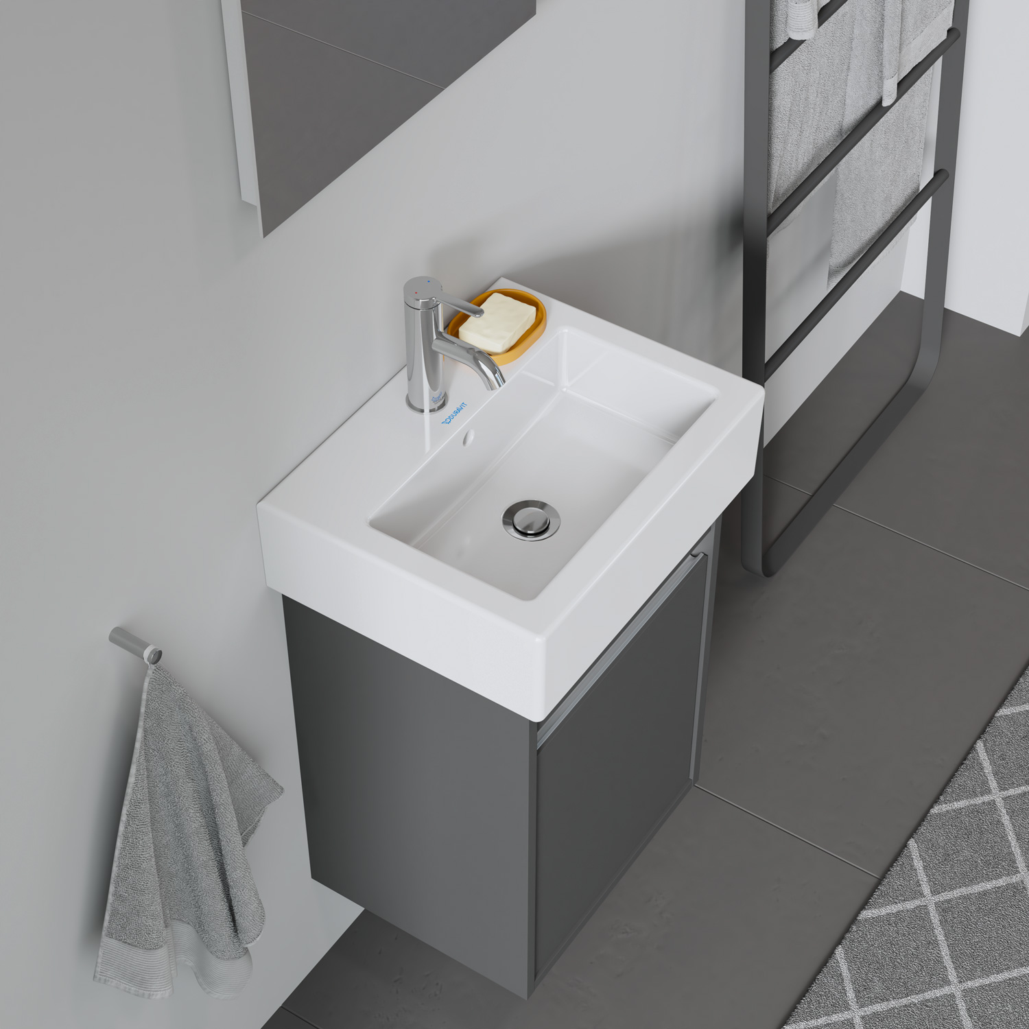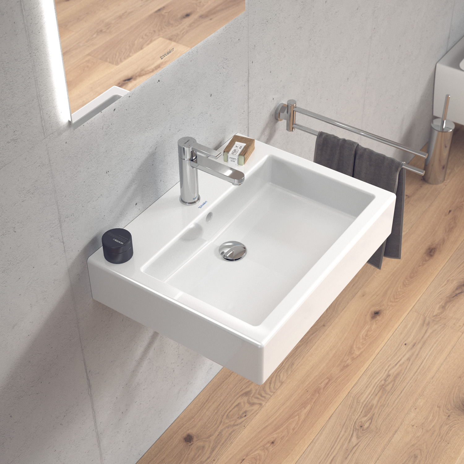 Прямоугольная форма хорошо вписывается в помещения любого размера. Доступные в различных размерах, они также хорошо подходят для небольших помещений, таких как гостевая ванная комната. Раковины для мытья рук Duravit Vero доступны шириной от 10 до 20 дюймов (от 25 до 50 см) и в различных стилях: вдоль стены, со смесителем сбоку, с большей внутренней раковиной и с без полки.