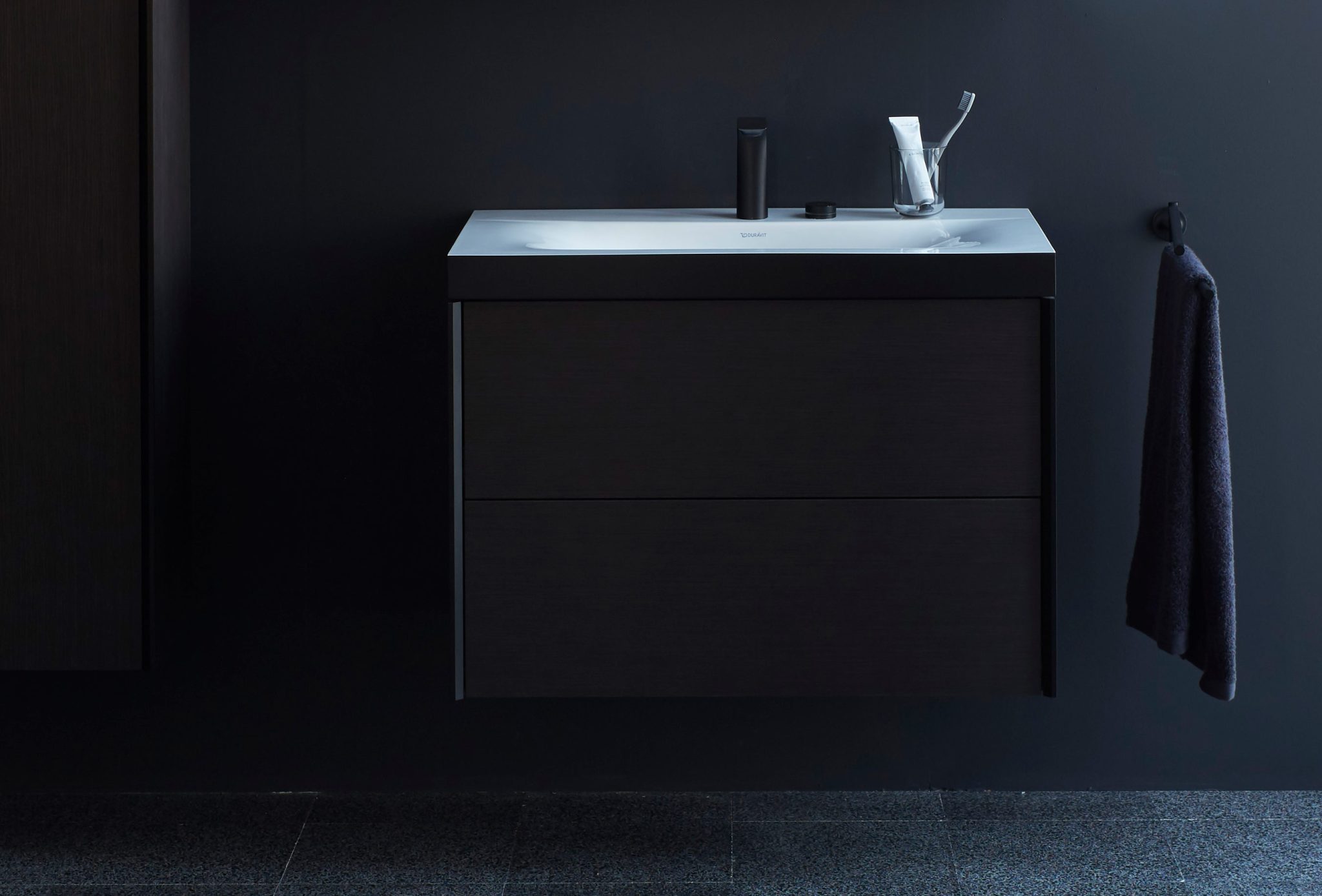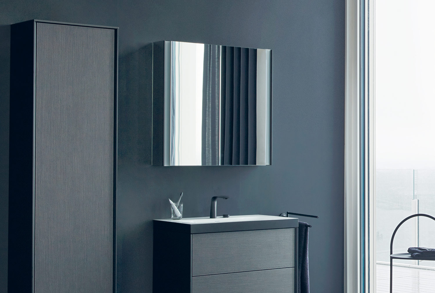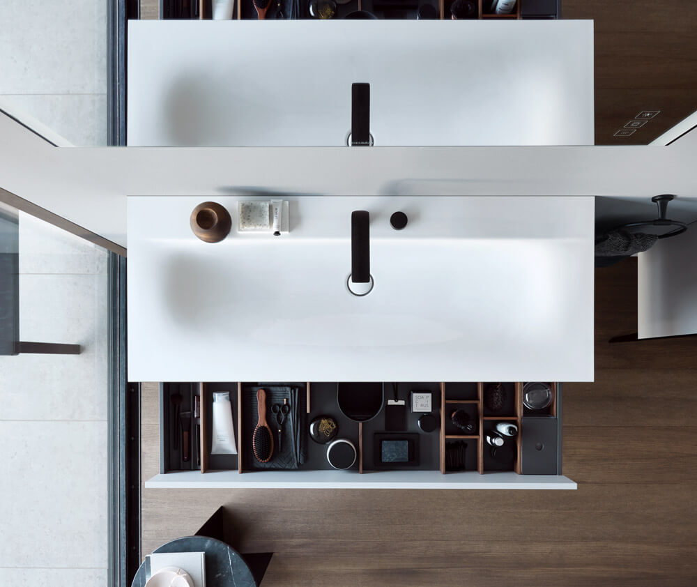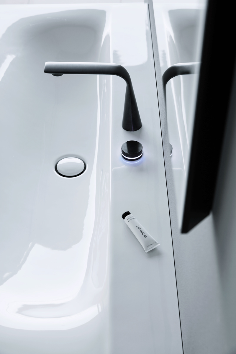 Четкие контрасты: мягкие, органичные формы и геометрически точные контуры. Светлые и темные материалы. От зоны для умывания до отдельно стоящей ванны и высокого шкафа: повторяющиеся характерные элементы дизайна объединяют и идеально сочетаются со всеми помещениями.