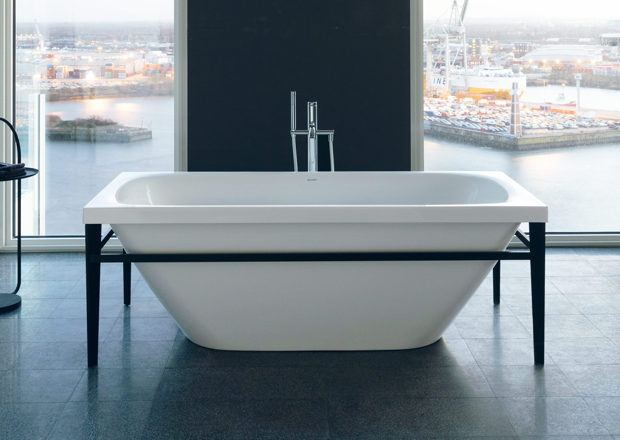 Еще одним изюминкой серии XViu является отдельно стоящая ванна, привлекающая внимание. Здесь также выдающаяся металлическая рама со знакомым V-образным профилем выполнена в матовом цвете шампанского или черном матовом в отличие от глянцевого белого акрила.