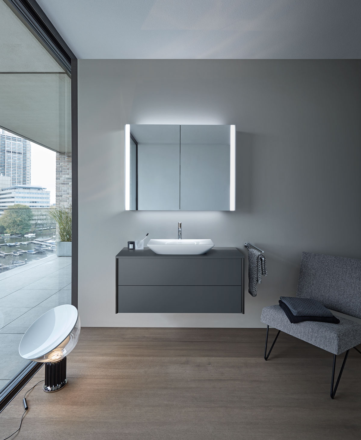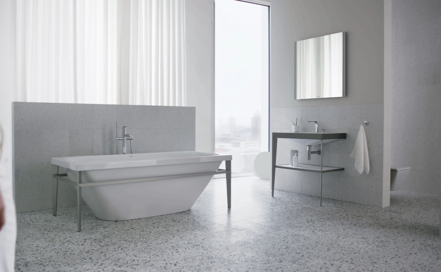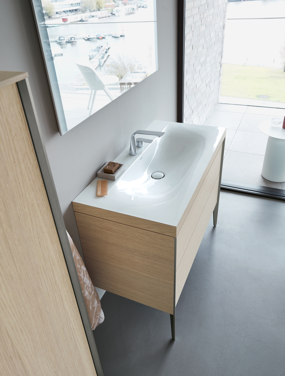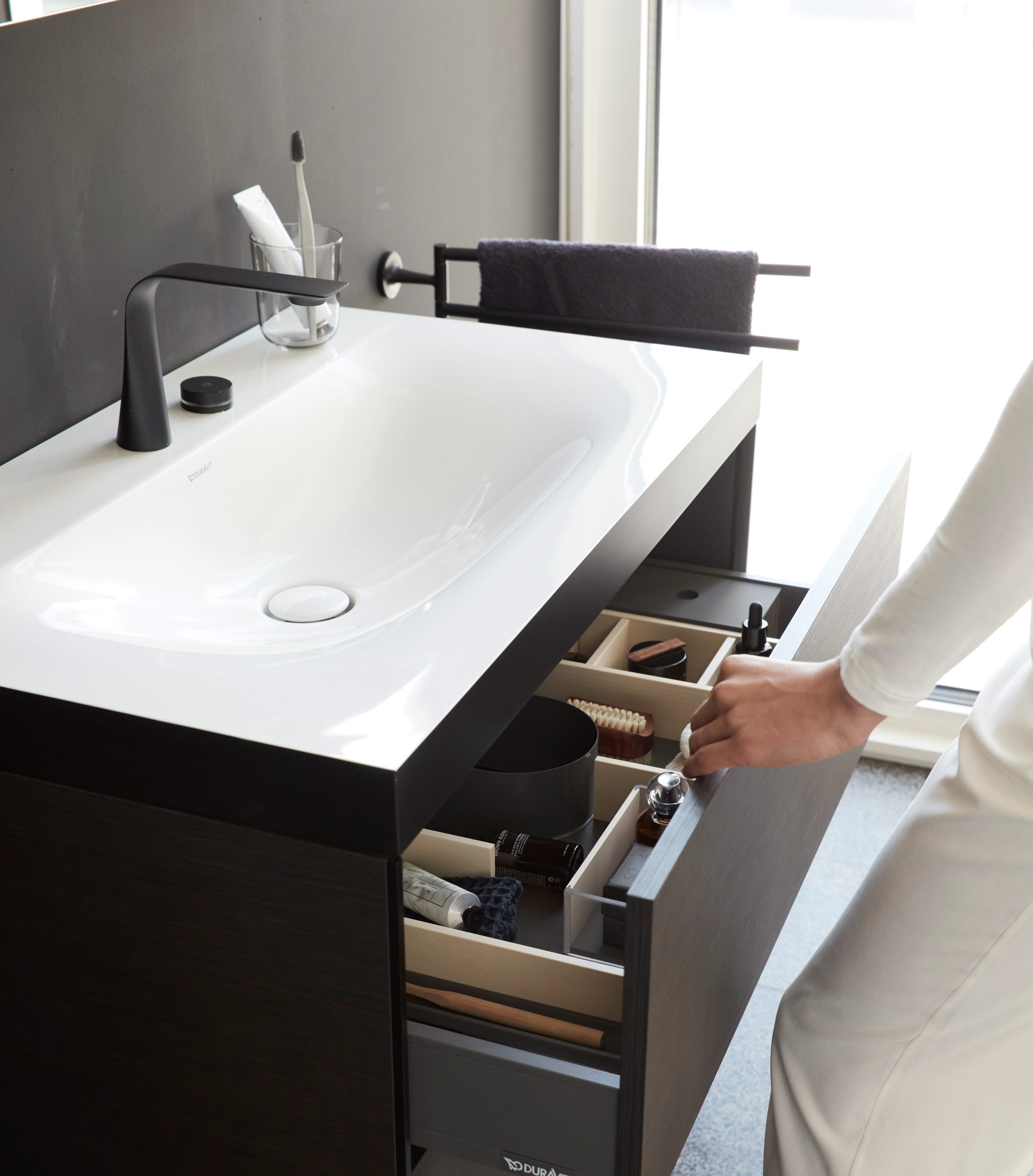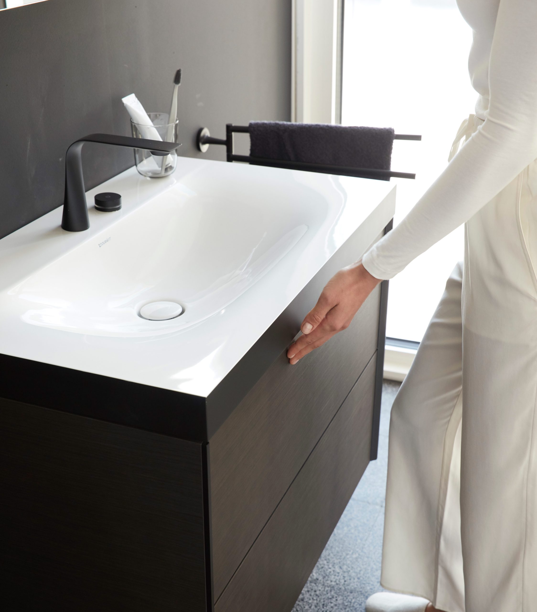 Четкие контрасты: мягкие, органичные формы и геометрически точные контуры. Светлые и темные материалы. От зоны для умывания до отдельно стоящей ванны и высокого шкафа: повторяющиеся характерные элементы дизайна объединяют и идеально сочетаются со всеми помещениями.