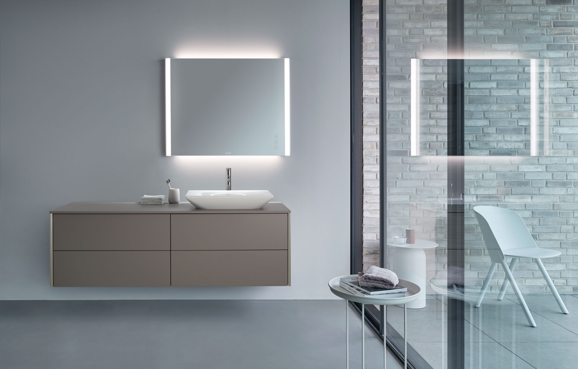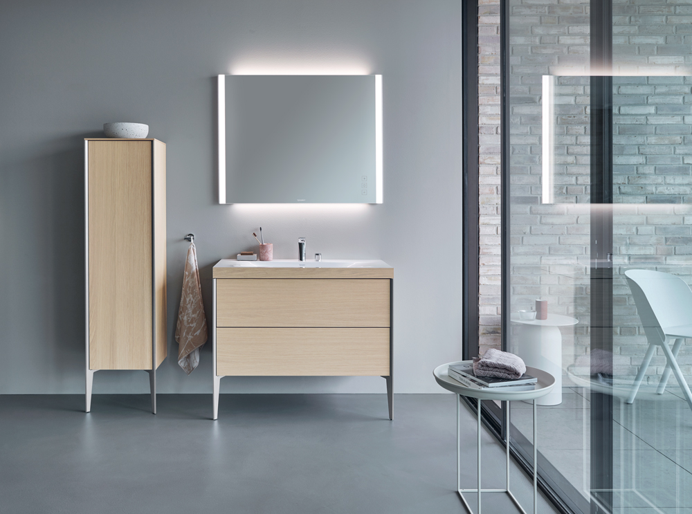 Боковые профили зеркальных шкафов с полностью зеркальными сторонами отражают индивидуальный язык дизайна XViu. Вариант с пиктограммой управления на поверхности зеркала, впервые среди зеркальных шкафов, также имеет режим рассеянного освещения и функцию переключения цветного освещения.